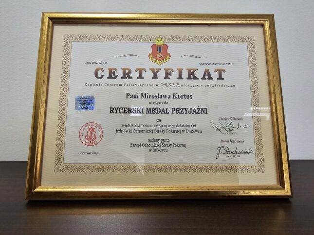 2023 Rycerski Medal Przyjaźni za wieloletnią pomoc i wsparcie w działalności jednostki Ochotniczej Straży Pożarnej w Bukowcu Organizator: Kapituła Centrum Falerystycznego ORDER |